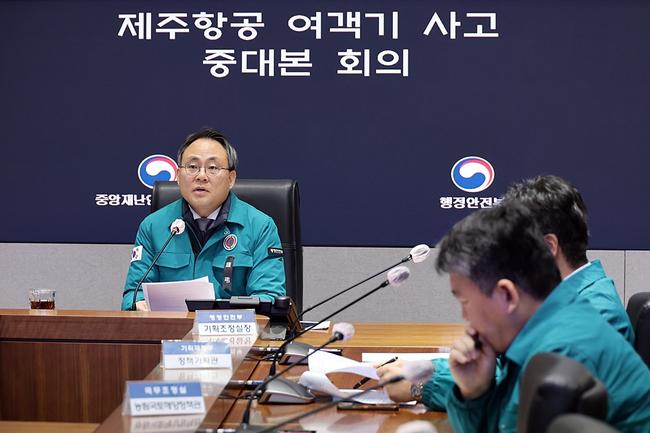 고기동 행정안전부 장관 직무대행이 6일 오전 서울 종로구 정부서울청사 서울상황센터에서 제주항공 여객기 사고 중앙재난안전대책본부 11차 회의에 참석하여 모두 발언을 하고 있다.