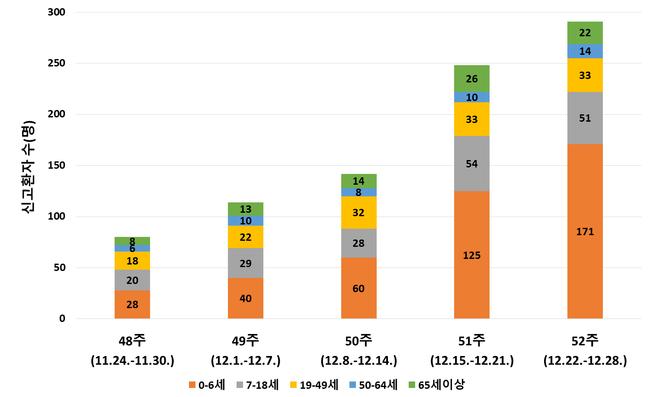 질병관리청은 겨울철 대표적 유행 질환인 노로바이러스 감염증 환자가 급증하고 있다고 밝혔다. 최근 5주간 노로바이러스 감염증 환자 수는 48주 80명에서 52주 291명으로 3.6배 증가했으며, 특히 0~6세 영유아 환자가 전체의 58.8%를 차지해 어린이집 등 영유아 시설의 위생 관리가 중요하다고 강조했다.
