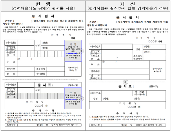 이번 지침 개정안에 따르면 앞으로 서류전형과 면접으로 선발하는 경력채용에서는 외모에 따른 선입견을 배제하기 위해 사진없는 응시원서와 이력서를 사용하게 된다. 지금까지는 본인확인용 사진을 부착한 공채의 응시원서를 함께 사용해 왔다.