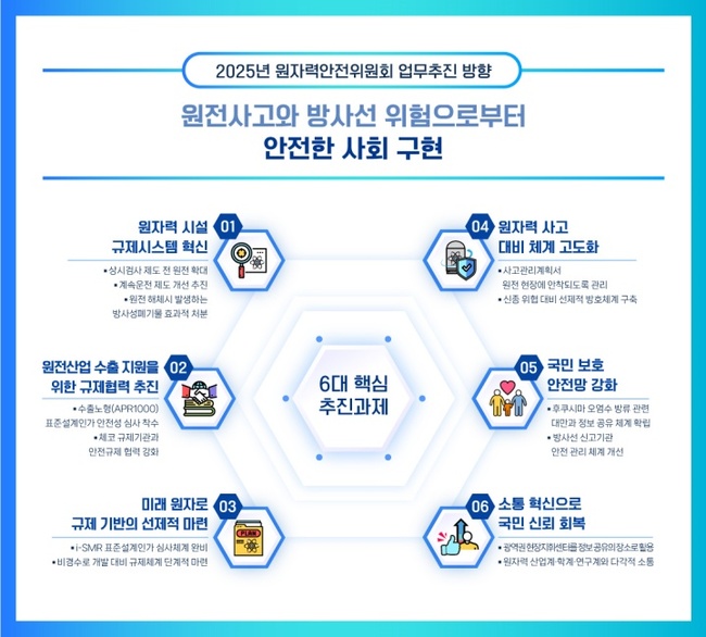 국민 안전을 위한 원자력 안전의 책임성·효과성 강화와 국민 안심을 위해 세심하게 다가가는 소통에 초점을 맞춰 6개 핵심과제를 추진할 계획이다.