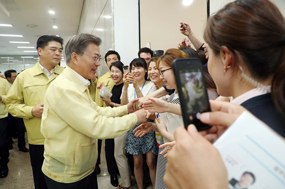 문재인 대통령이 22일 오후 정부 과천청사에서 과학기술정보통신부와 방송통신위의 핵심 정책토의에 참석하기 위해 입장하던 중 공무원들의 환영을 받고 있다. (사진=청와대) |