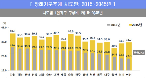 17개 시·도 모두에서 2045년 가장 많은 가구유형은 1인가구가 될 것으로 전망됐다. 특히 강원은 혼자 사는 가구의 비중이 2015년 31.2%에서 2045년 40.9%로 상승한다.
