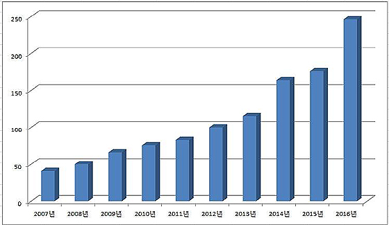 이들 디자인 출원은 2007년에는 24건에 불과했으나 2016년 94건으로 4배 가량 증가했다.