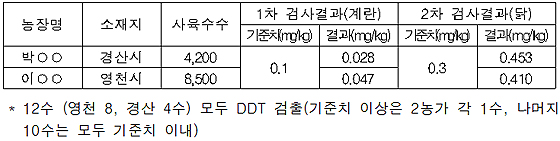 한편, 기사는 경북 동물위생시험소가 이 농장의 닭을 가져다가 검사를 해봤더니 닭 2마리에서 DDT 성분 허용기준치를 초과 검출됐다 고 보도했다.
