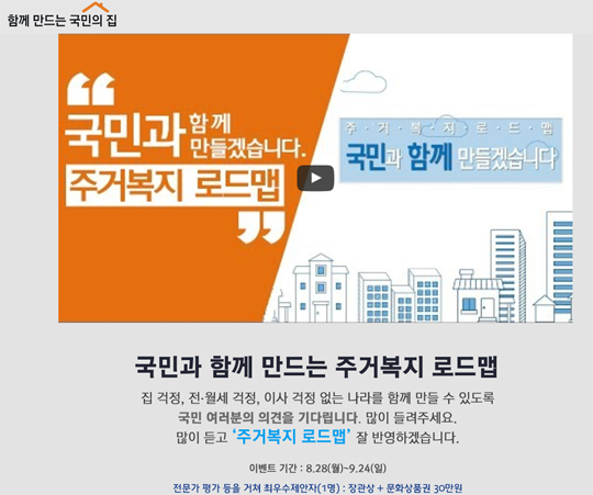 이는 9월 말 발표 예정인 ‘주거복지 로드맵’을 마련하기에 앞서 국민들의 의견을 듣고 제안을 받는 등 실제 국민이 원하는 주거복지의 청사진을 로드맵에 반영하기 위한 것이다.