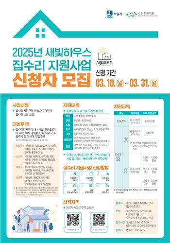 [일간환경연합 김경훈 기자] 수원시(시장 이재준)가 저층 주거지의 집수리를 지원하는 `새빛하우스` 사업에 참여할 가구를 오는 3월 10일부터 31일까지 모집한다.