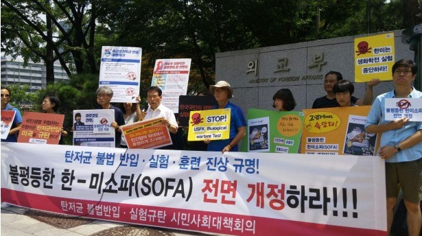 [일간환경연합 황천보기자] 지난 7월 15일(수) 오후 1시 30분에 환경운동 단체인 “녹색연합”은 외교부 정문 앞에서 탄저균 불법반입·실험규탄과 한미소파(SOFA) 전면 개정하라라는 주제로 개정 촉구 기자회견을 열었다.