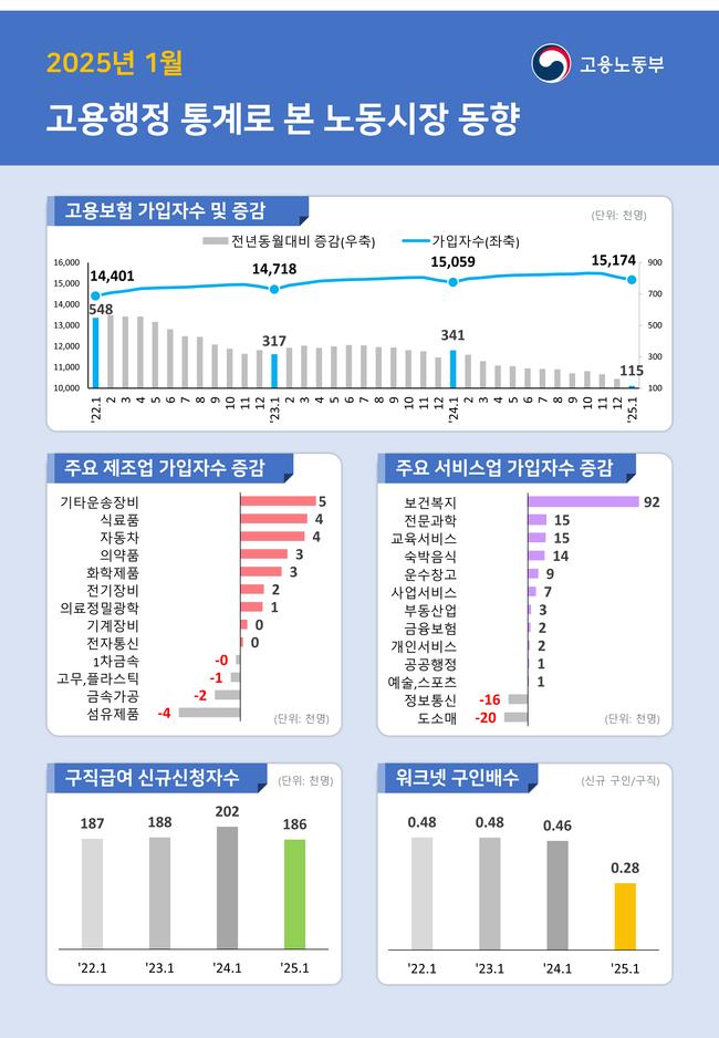 [일간환경연합 김경훈 기자] 고용노동부가 10일 발표한 ‘2025년 1월 고용행정 통계’에 따르면, 1월 말 기준 고용보험 가입자는 1,517만 4천 명으로 전년 동월 대비 11만 5천 명(0.8%) 증가한 것으로 나타났다.