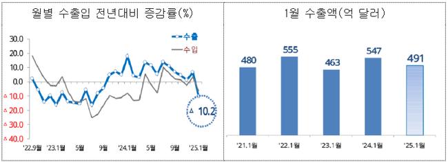 [일간환경연합 신상미 기자] 올해 1월 한국의 수출이 전년 동기 대비 10.2% 감소한 491억 달러를 기록하며 16개월 만에 감소세로 돌아섰다. 같은 기간 수입은 6.4% 감소한 510억 달러로 집계되며, 무역수지는 19억 달러 적자를 나타냈다. 이는 20개월 만에 적자로 전환된 것이다.