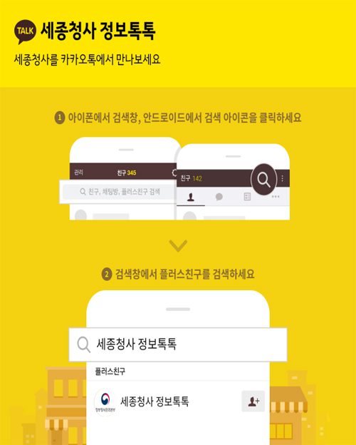 모바일서비스를 이용하려면 개인 스마트폰에서 카카오톡을 실행한 후 ‘세종청사 정보톡톡’을 찾아 친구로 추가하면 된다.