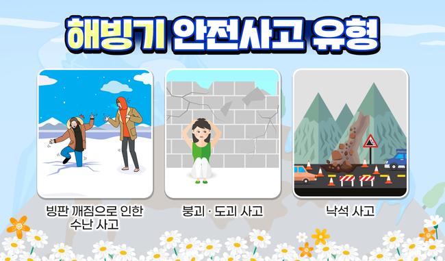 소방청은 해빙기 안전사고 예방을 위해 ▲축대·옹벽 주변 균열·지반침하 확인 ▲낙석주의 구간 서행 ▲공사장 주변 주의 ▲등산 시 미끄럼·낙석 주의 등을 당부했다.