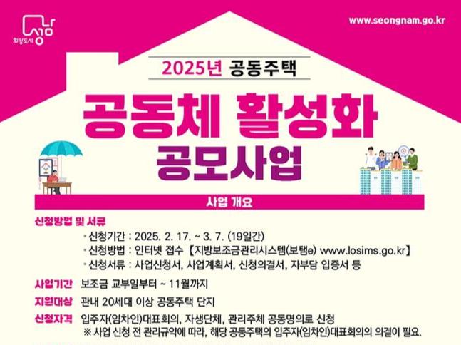 [일간환경연합 김경훈 기자] 성남시(시장 신상진)는 20세대 이상의 공동주택 단지를 대상으로 3월 7일까지 `2025년도 공동체 활성화 사업`을 공모한다.