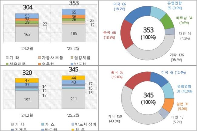 2월 1~20일 수출은 353억 달러로 전년 대비 48.8억 달러 증가(16.0%)했다.