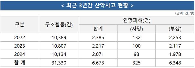 [일간환경연합 신상미 기자] 소방청은 봄철을 맞아 등산객이 증가함에 따라 산악사고 예방에 각별한 주의를 당부했다. 최근 3년간(2022~2024) 산악사고 구조활동 건수는 총 31,330건으로, 연평균 1만 건이 넘는 사고가 발생한 것으로 나타났다. 이로 인해 325명이 사망하고 6,348명이 부상을 입었다.