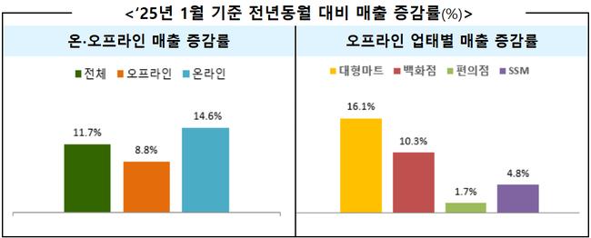 [일간환경연합 장민주 기자] 2025년 1월 국내 주요 유통업체들의 매출이 전년 동월 대비 11.7% 증가한 것으로 나타났다. 산업통상자원부가 25일 발표한 자료에 따르면, 오프라인 매출은 8.8%, 온라인 매출은 14.6% 각각 상승했다.