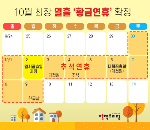 [일간환경연합 신상미 기자]올해 추석 연휴 시작 전 10월 2일(월요일)이 임시공휴일로 지정돼 열흘간의 황금연휴가 확정됐다.