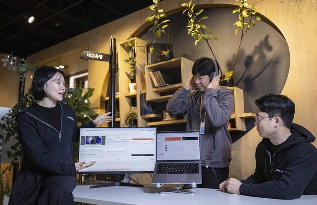 허드슨에이아이 신현진 대표와 임직원이 전시에 선보일 AI더빙 솔루션을 테스트하는 모습