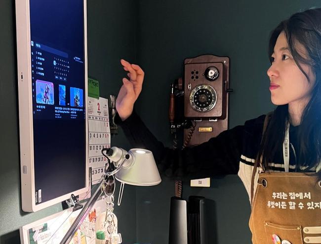 라이프집 부스에서 LG 스탠바이미2를 체험해보고 있는 모습.