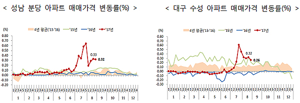 전반적인 안정세 속에 일부지역은 시장과열 우려를 지속했다. 성남시 분당구와 대구시 수성구는 8·2대책 이후에도 주간 아파트 가격상승률이 0.3% 내외를 지속 기록하는 등 높은 상승세이며, 인천시, 안양시 등도 완만한 상승세를 보이고 있다.