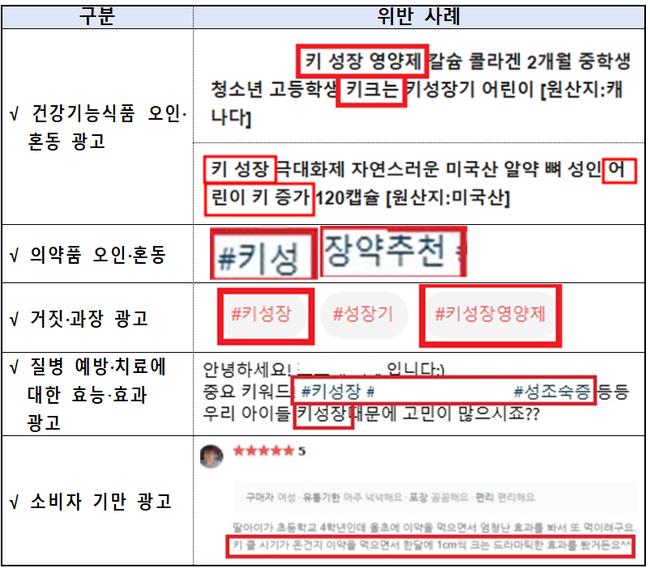 식약처에 따르면, 온라인에서 판매되는 키 성장 관련 식품 200건을 점검한 결과, ▲‘키성장 영양제’ 등 일반식품을 건강기능식품으로 오인하게 하는 광고(99건, 85.3%) ▲‘키 성장’ 효과를 과장하는 거짓 광고(10건, 8.6%) ▲식품을 의약품처럼 보이게 하는 광고(5건, 4.3%) ▲질병 예방·치료 효과를 내세운 광고(1건, 0.9%) ▲소비자 체험기를 이용한 기만 광고(1건, 0.9%) 등의 사례가 확인됐다.