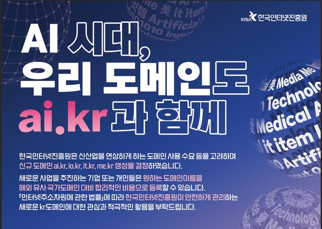 [일간환경연합 장민주 기자] 과학기술정보통신부(장관 유상임, 이하 과기정통부)는 5일부터 신규 3단계 kr 인터넷 주소(도메인) ‘ai.kr’, ‘it.kr’, ‘io.kr’, ‘me.kr’의 일반 등록 접수를 시작한다고 밝혔다. 이는 22년 만에 새롭게 도입되는 kr 도메인으로, 인공지능(AI) 등 신기술과 신산업의 발전에 맞춰 인터넷 주소 수요를 반영하기 위한 조치다.
