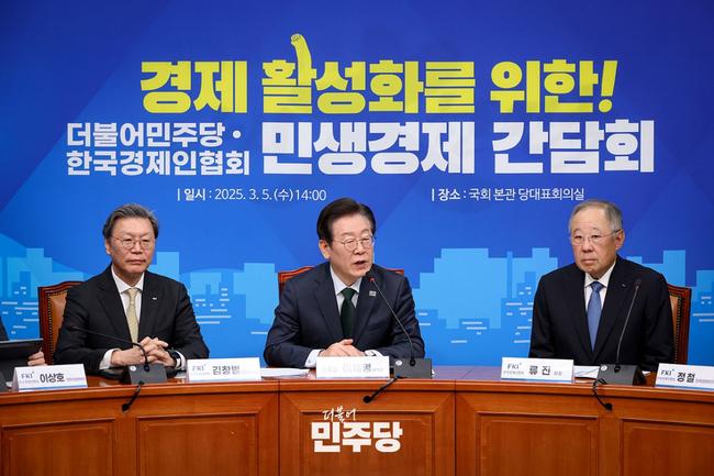 이재명 더불어민주당 대표가 5일 국회에서 열린 한국경제인협회(한경협) 임원진과의 민생경제 간담회에서 `기업과 정치권이 경제 발전을 위해 함께 노력해야 한다`고 강조했다.