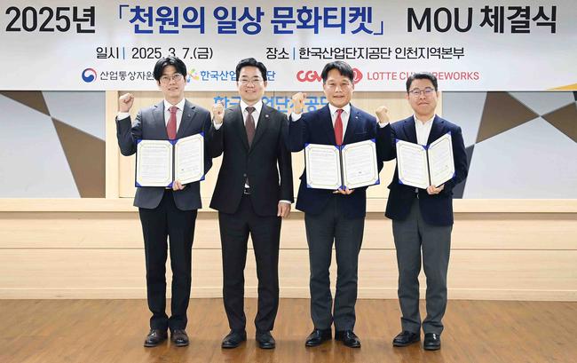 [일간환경연합 한선미 기자] 산업통상자원부는 3월 7일 인천남동산업단지에서 한국산업단지공단(CGV, 롯데컬처웍스)과 함께 ‘천원의 일상 문화티켓’ 협약식을 개최하고, 산업단지 근로자들의 문화·여가 생활 지원을 위한 협력 방안을 논의했다.
