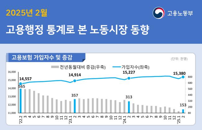 [일간환경연합 김경훈 기자] 2025년 2월말 기준 고용보험 상시가입자는 1,538만명으로 전년동월대비 15만 3천명(+1.0%) 증가했다. 고용보험 상시가입자수는 작년 9월 1,545만명에서 올해 1월 1,517만명으로 감소세를 보이다가 2월에 다시 증가세로 전환되었다.