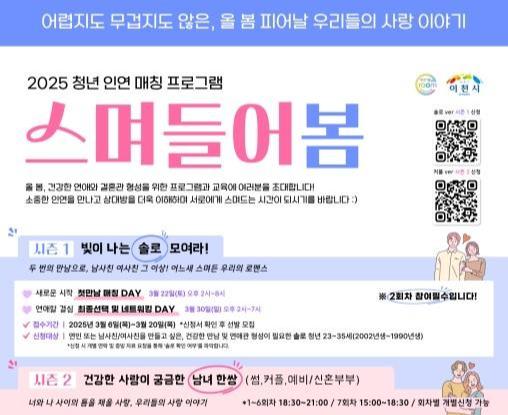 커플 매칭부터 결혼 준비 교육까지, 다양한 주제의 교육 및 활동으로 구성된 본 프로그램은 관내 솔로 청년을 대상으로 ▲첫 만남 매칭데이 ▲최종 선택 및 네트워킹데이 순으로 진행한 후 매칭된 커플과 예비부부를 대상으로 ▲사랑의 다섯 가지 언어 특강 ▲커플 요리 체험&콘테스트 ▲커플 TCI 기질 검사 ▲사진 체험&콘테스트 ▲출산 준비 교육 ▲선배 부부 초청 토크쇼 ▲통합 네트워킹 순으로 운영한다. 솔로 부문은 23세∼35세(2002년생∼1990년생), 커플 부문은 19세∼39세(2006년생∼1986년생)까지 신청할 수 있으며, 포스터 큐알(QR)코드 또는 이천시 누리집(청년이룸)을 통해 접수하면 된다.