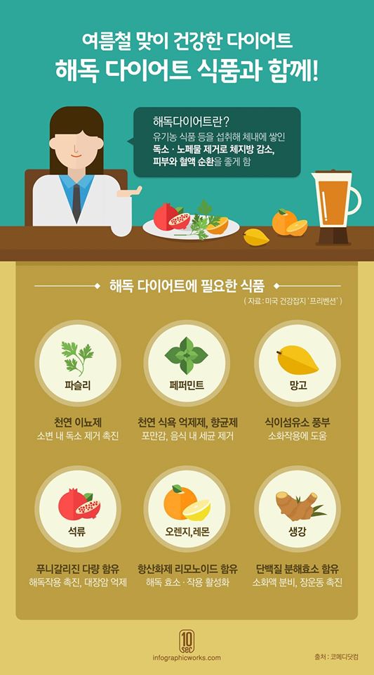 다음은 미국의 건강잡지 ‘프리벤션’에 소개된 해독 다이어트에 필요한 식품들인데요, 여름을 맞이하여 다이어트로 고민 중이신 분들, 해독다이어트 식품과 함께 가볍고 건강한 다이어트를 시작해보는 건 어떨까요?