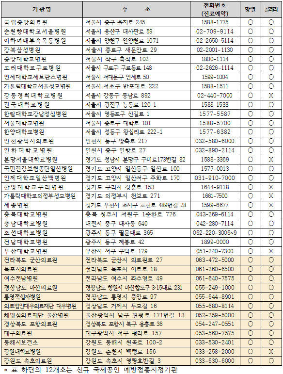 국제공인 예방접종지정기관 현황. |