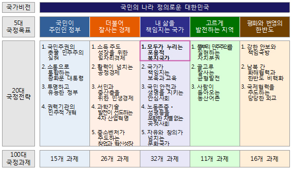 정부는 ‘내 삶을 책임지는 국가’라는 국정목표 하에 ‘모두가 누리는 포용적 복지국가’를 20대 국정전략의 하나로 추진하고 있다.
