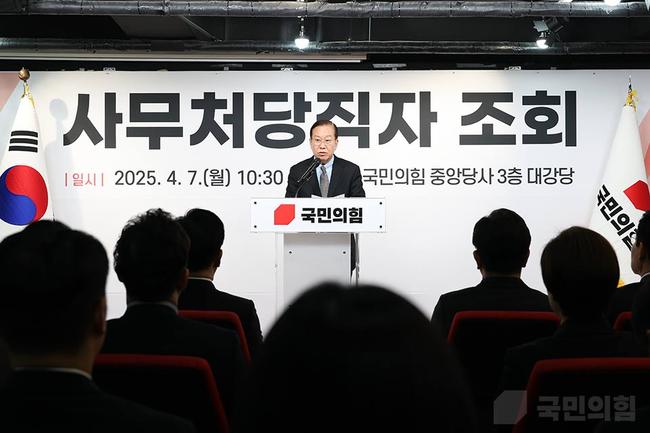 [일간환경연합 신상미 기자] 국민의힘 권영세 비상대책위원장은 7일 오전 서울 여의도 당사 강당에서 가진 당 사무처 당직자 조회에 참석해 “이번 대선은 단순한 정권 재창출이 아니라 자유민주주의와 대한민국 체제를 수호하는 싸움”이라며 당직자들과 함께 본격적인 비상체제 돌입을 선언했다.
