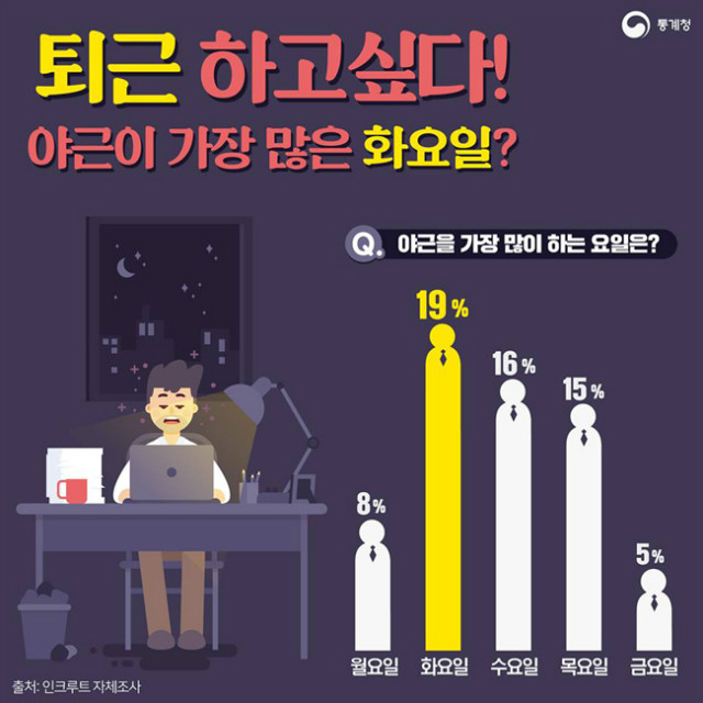 [일간환경연합 한선미 기자]취업포털 인크루트가 직장인 947명을 대상으로 ‘주 중에 야근을 언제 하는지’ 설문조사를 실시한 결과 ‘화요일’이 19%로 가장 많은 비율을 차지했습니다.