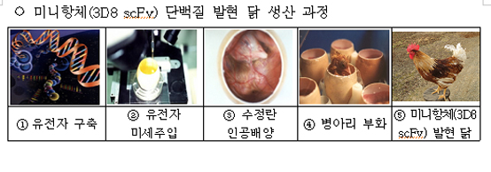 농촌진흥청은 성균관대와 아주대 의대, 건국대 연구팀과 공동으로 8년간의 연구 끝에 ‘미니항체(3D8 scFv) 단백질’을 개발하고 닭에서 단백질 발현을 유도했다.