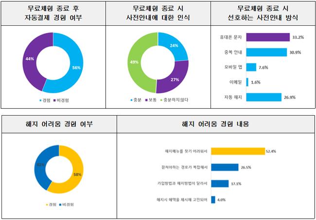 특히 응답자의 56%는 무료 체험 후 자동결제를 경험했다고 답했으며, 이 중 절반 가까이는 “사전 안내가 충분치 않았다”고 느꼈다. 무료 체험 종료 안내 방식으로는 ‘휴대폰 문자’가 가장 선호됐다.