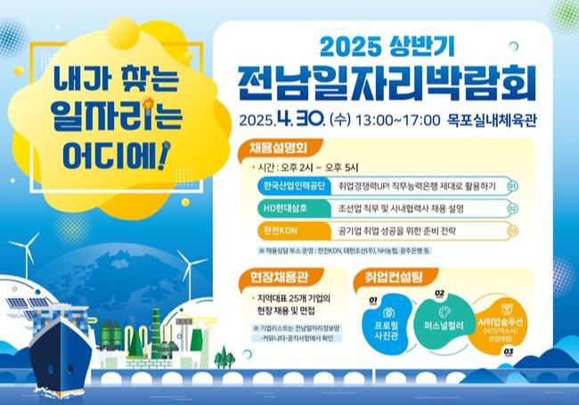 [일간환경연합 김경훈 기자] 전라남도는 오는 30일 목포실내체육관에서 `2025 상반기 전남일자리박람회`를 개최한다. 조선업·식품 제조업·관광숙박 등 다양한 분야 28개 기업에서 148명 채용을 목표로 하고 있다.