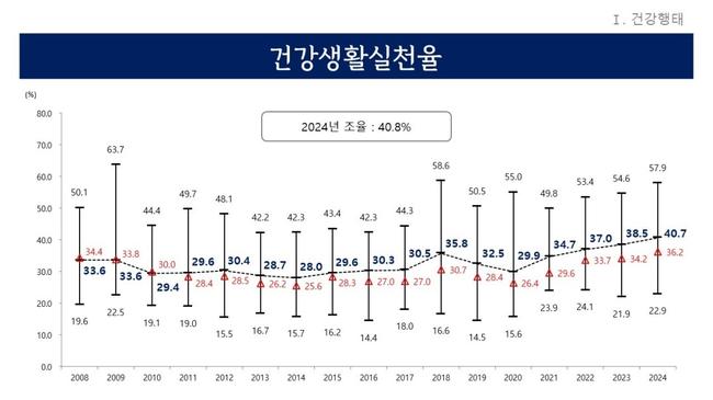 먼저 금연, 절주, 걷기 모두를 실천한 복합지표인 `건강생활실천율`이 전국 중앙값 36.2%보다 4.5% 높은 40.7%로 나타났다. 이는 지역사회건강조사를 실시한 2008년 이후 역대 최고치다. 경기도의 건강생활실천율은 2014년 28%로 낮아졌다가 2023년 38.5%로 최고치를 기록한 이후 1년 만에 다시 갱신했다. 시군별로는 과천시 57.9%, 성남시 분당구 56.5%, 용인시 수지구 54.7% 순으로 높은 수치를 나타냈다.