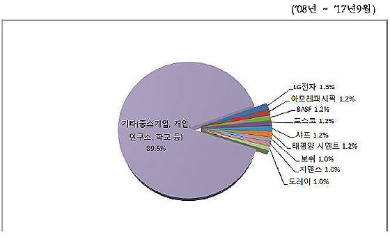출원인별로 살펴보면 LG전자, 아모레퍼시픽, 포스코 등의 국내기업과 샤프, 태평양 시멘트, 도레이 등의 일본 기업의 출원이 많았고 그 외 바스프, 보쉬, 지멘스 등의 독일 기업이 상위 출원기업에 포함된 것이 눈에 띈다.