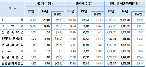 문화체육관광부는 한국문화관광연구원과 함께 2016년 관광사업체 기초통계조사 결과를 19일 발표했다.