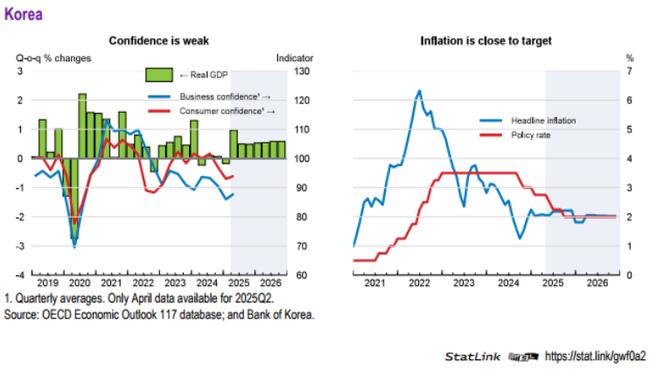 경제협력개발기구(OECD)가 3일 한국경제에 대해 관세 및 대외 불확실성이 수출과 투자를 제약하는 가운데, 민간소비는 정치적 불확실성 완화와 실질임금 상승에 힘입어 2025년 후반 이후 회복될 것으로 예상한다고 분석했다.