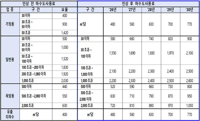 서울시는 2030년까지 하수도요금 현실화율을 80%까지 끌어올리기 위해, 2026년부터 연평균 84.4원씩 요금을 인상할 계획이다. 가정용 요금은 연평균 ㎥당 72원(인상률 13.4%) 인상되며, 2025년 410원에서 2030년 770원까지 상승한다. 일반용은 ㎥당 117.6원씩 인상돼 1,592원에서 2,180원으로 오르게 된다.
