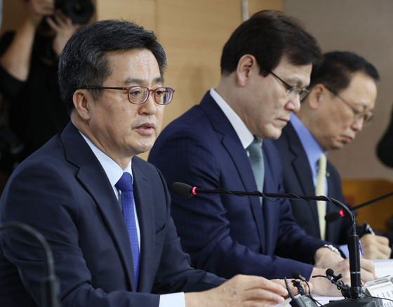 김동연 부총리 겸 기획재정부 장관이 24일 오후 정부서울청사에서 가계부채 종합대책을 발표하고 있다. 왼쪽부터 김동연 부총리, 최종구 금융위원장, 최흥식 금융감독원장.(사진=연합뉴스 제공) |