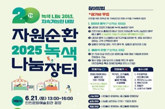 [일간환경연합 김경훈 기자] 인천광역시(시장 유정복)는 탄소중립 실천과 나눔 문화 확산을 위해 인천시가 주최하고 인천YWCA가 주관하는 `2025 자원순환 녹색 나눔장터`(이하 나눔장터)를 오는 6월 21일 인천종합문화예술회관 광장에서 개최한다고 밝혔다.