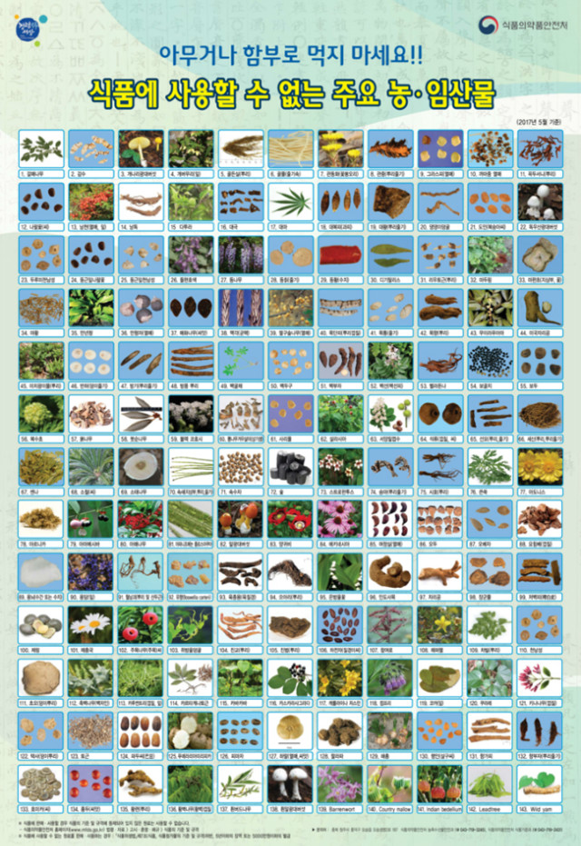 [일간환경연합 신상미 기자]식품에 사용할 수 없는 농산물을 약령시장이나 인터넷을 통해 구입해 드시는 분들이 많은데요. 일부 농·임산물은 함부로 먹을 경우 유해할 수 있어 주의가 필요합니다.
