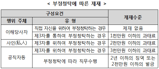 승진·채용 청탁행위, 청탁에 따른 인사 부당지시 행위, 공직자 등이 청탁에 따라 직무를 수행한 경우는 청탁금지법(제5조 제3호) 위반에 해당해 청탁자에게는 과태료가 부과되고 청탁에 따라 직무를 수행한 공직자는 형사처벌된다.