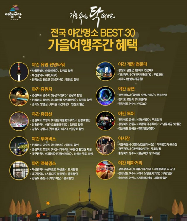 [일간환경연합 한선미 기자]가을여행 주간(10/21~11/5)을 맞아, 전국에서 손꼽히는 밤 여행 명소를 소개합니다. 올가을, 낮보다 밤에 더 아름다운 그곳에서 매력적인 야경을 마음껏 즐겨보세요!