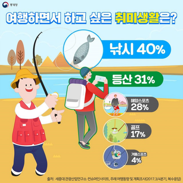 15일 세종대 관광산업연구소와 컨슈머인사이트가 올해 3분기에 ‘3개월 내 국내여행 중 취미나 운동 활동 계획’이 있는 501명을 대상으로 조사한 결과(중복응답)에 따르면 ‘낚시를 하겠다’는 사람이 40%로 등산(31%)을 제치고 1위에 올랐습니다.