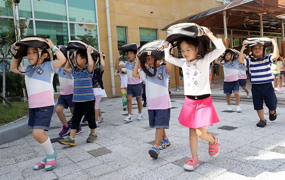 부산 기장군 정관읍 가동유치원에서 열린 지진대피훈련에서 어린이들이 책가방을 머리에 이고 운동장으로 대피하고 있다.(사진=연합뉴스 제공) |