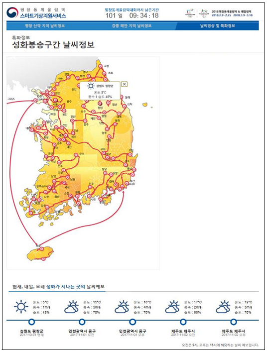 개·폐회식장을 비롯한 12개 경기장에 대한 상세 기상정보와 위성, 레이더, 도로위험기상정보 등의 특화 정보도 제공한다.